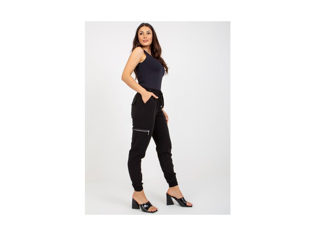 Čierne dámske cargo nohavice s vysokým pasom. Elastický pás a sťahovacia šnúrka na nastavenie šírky. Zašité vrecká na zadnom diele.